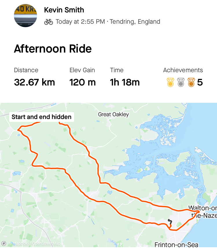 With 15km to go I turned left at Jaywick Lane to make my way back past Clacton Golf Club and the seafront only to realise it was now all into wind – very poor judgement!