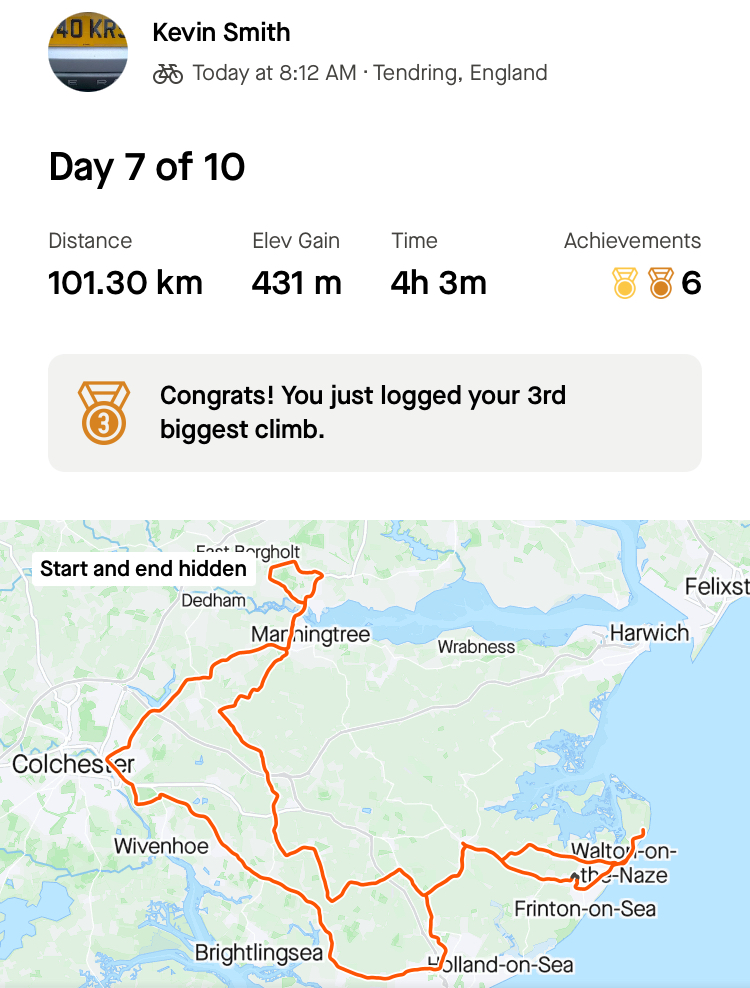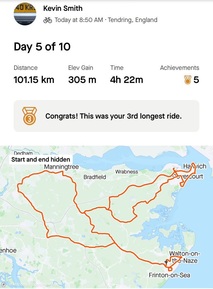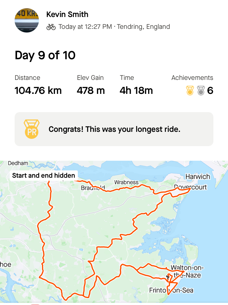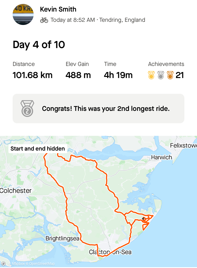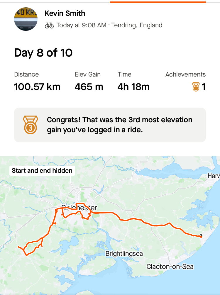 So, day 4 all done, tomorrow sees me head over to Harwich to meet up with another amazing man who is going to join me out on the road for 10km’s or so and I can’t wait for it.